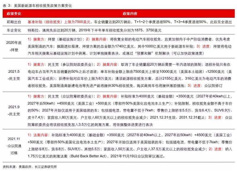 本次法案主要針對(duì)美國(guó)新能源車(chē)的稅收抵免政策。當(dāng)前美國(guó)新能源車(chē)稅收抵免政策為7500美元,且單一車(chē)企只能獲得累計(jì)20萬(wàn)輛的額度,特斯拉、通用累計(jì)銷(xiāo)售20萬(wàn)輛后均進(jìn)入退出階段。最新眾議院通過(guò)的方案,計(jì)劃提高稅收抵免最高至1.25萬(wàn)美元,其中補(bǔ)貼基礎(chǔ)金額為4000美元,若電池容量在2027年前為40kwh以上,2027年后50kwh 則額外獲得3500美元,若涉及車(chē)企為美國(guó)工會(huì)單位(主要是通用、福特等美系車(chē)企,不包括特斯拉、日系等)則額外獲得4500美元,若零部件50%美國(guó)化且電池本土生產(chǎn)則額外獲得500美元。該方案與前期提案僅有微調(diào),大體相似,符合預(yù)期。