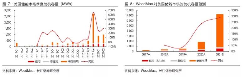 美國(guó)儲(chǔ)能市場(chǎng)自2020H2迎來(lái)爆發(fā)式增長(zhǎng),WoodMac數(shù)據(jù)顯示美國(guó)儲(chǔ)能市場(chǎng)2021Q2的數(shù)據(jù),裝機(jī)功率344MWh,同比增長(zhǎng)161%;裝機(jī)容量1015MWh,同比增長(zhǎng)306%。考慮表前市場(chǎng)將在2021H2迎來(lái)集中并網(wǎng),進(jìn)一步推動(dòng)裝機(jī)量抬升,WoodMac再度上修2021年美國(guó)裝機(jī)預(yù)期至14.6GWh,同比增長(zhǎng)289%。值得注意的是,這已是WoodMac年內(nèi)第二次上修裝機(jī)預(yù)期(2020Q4預(yù)計(jì)10GWh、2021Q1預(yù)計(jì)12GWh)。