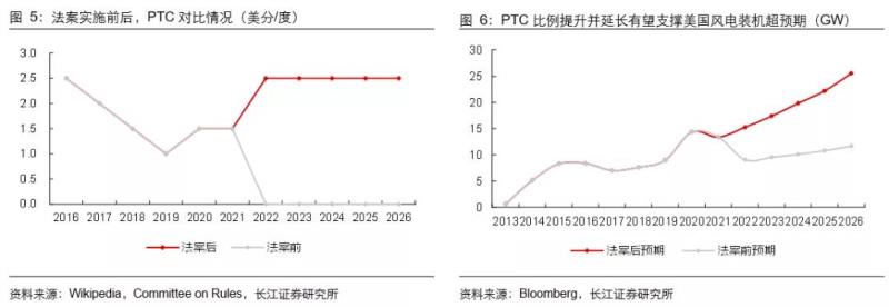 2015年底美國(guó)直接發(fā)布5年P(guān)TC,其中2016年建設(shè)的風(fēng)電項(xiàng)目的PTC額度為2.5美分/度,此后逐年遞減20%,即2017-2020年P(guān)TC分別將至2016年的80%/60%/40%/20%。2019年12月末,國(guó)會(huì)將2020年P(guān)TC從預(yù)期的20%提升到60%,以刺激風(fēng)電開(kāi)發(fā)。2020年12月,國(guó)會(huì)再次將60%的PTC延期至2021年,同時(shí)計(jì)劃2022年后開(kāi)工的項(xiàng)目不再有PTC優(yōu)惠。