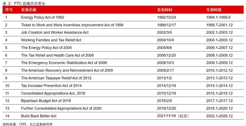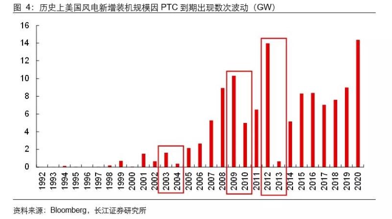 PTC最早于1992年提出并應(yīng)用于風(fēng)能和生物質(zhì)能,此后在布什、奧巴馬等總統(tǒng)期間共歷經(jīng)12次延期并擴(kuò)大應(yīng)用范圍。我們認(rèn)為歷史上PTC對(duì)美國(guó)風(fēng)電規(guī)模起到重要作用的依據(jù),在于其裝機(jī)規(guī)模往往在PTC到期前急劇增長(zhǎng),而在PTC失效年份則快速下降,如2003-2004、2009-2010、2012-2013等。