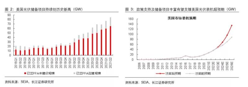 近幾年美國(guó)市場(chǎng)在經(jīng)濟(jì)性及搶裝帶動(dòng)下,光伏裝機(jī)規(guī)模持續(xù)高增,2020年新增裝機(jī)規(guī)模達(dá)到19.2GW。同時(shí),儲(chǔ)備項(xiàng)目豐富,2021Q2末已簽PPA項(xiàng)目已經(jīng)達(dá)到85GW,相比2019年實(shí)現(xiàn)翻倍項(xiàng)目積累。2022-2026年美國(guó)光伏項(xiàng)目的ITC將由當(dāng)前的26%提升至30%,并且我們觀察到2021年11月10日及16日美國(guó)商務(wù)部駁回對(duì)中國(guó)企業(yè)東南亞產(chǎn)能的反規(guī)避調(diào)查及雙玻組件201關(guān)稅豁免,貿(mào)易摩擦緩和亦有助于美國(guó)光伏成本的下降,此外考慮到后續(xù)幾年光伏產(chǎn)業(yè)鏈價(jià)格重回下降通道,我們預(yù)計(jì)美國(guó)光伏項(xiàng)目的經(jīng)濟(jì)性有望顯著提升,刺激裝機(jī)爆發(fā)。