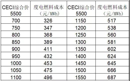 根據(jù)中國沿海電煤采購價(jià)格指數(shù)(CECI沿海指數(shù)),第179期(10月28日至11月4日)的5500綜合價(jià)格為1220元/噸,第180期(11月4日至11月11日)的5500綜合價(jià)格為1095元/噸,第181期(11月11日至11月18日)的5500綜合價(jià)格為983元/噸。也就是說沿海60萬機(jī)組的度電燃料成本大約在500元~600元/MWH左右。