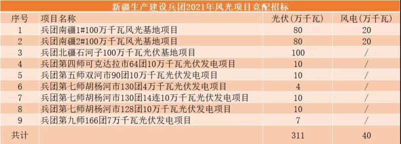 中國儲能網(wǎng)訊:11月19日,新疆生產(chǎn)建設兵團發(fā)布2021年風電、光伏發(fā)電項目競配招標公告。此次招標總規(guī)模351萬千瓦,共分為9個標段。其中光伏311萬千瓦,風電40萬千瓦。具體項目如下: