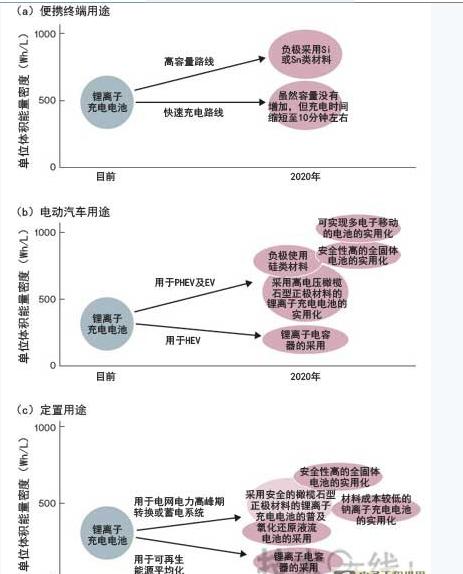 便攜終端用途方面,技術(shù)開發(fā)重心是高容量化(a)。電動汽車用途方面,EV及PHEV用途的目標(biāo)是使可實現(xiàn)高容量化的電池達到實用水平,此外HEV用途有望采用鋰離子電容器(b)。定置用途方面,估計在面向蓄電系統(tǒng)提高安全性與壽命的同時,以降低成本為目標(biāo)的新型電池的開發(fā)也會不斷推進(c)。