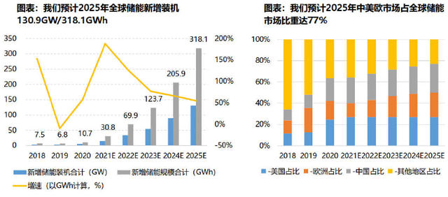 隨著新能源發(fā)電占比越來(lái)越高以及儲(chǔ)能經(jīng)濟(jì)性拐點(diǎn)到來(lái),儲(chǔ)能市場(chǎng)迎來(lái)爆發(fā),預(yù)計(jì)到2025年全球新增儲(chǔ)能裝機(jī)達(dá)到130.9GW/318.1GWh,2021-2025年復(fù)合增速為79%,到2030年新增儲(chǔ)能裝機(jī)達(dá)到535.8GW/1575.0GWh,2021 -2030年復(fù)合增速為55%,中國(guó)、美國(guó)、歐洲將是最大增量市場(chǎng)。