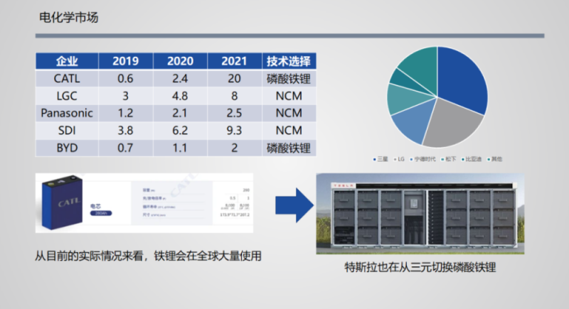 各家在鋰電池的技術(shù)路線上也分為兩派,寧德時代和比亞迪堅(jiān)定地走磷酸鐵鋰路線,而其余三家均在走三元鋰路線,特斯拉則從三元鋰切換成磷酸鐵鋰。這或與各家自身優(yōu)勢和對電儲能市場判斷及投入力度有關(guān)。