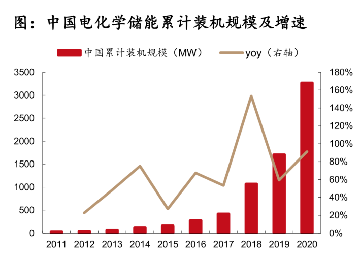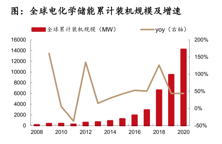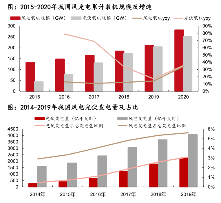 連鎖反應(yīng)之一就是,火電的替代品風(fēng)電和光伏的比重越來越高。我國2020年風(fēng)電和光伏累計裝機(jī)量已經(jīng)由2015年的131/43GW增至282/252GW,累計占比已經(jīng)超過20%,隨著風(fēng)電和光伏成本的持續(xù)下降,其占比依然在提升。而前文提到,風(fēng)電和光伏電的消納問題嚴(yán)重,為了減少浪費(fèi)和避免對電網(wǎng)的沖擊,風(fēng)電和光伏電需要電儲能的配套,這樣才有利于滿足電網(wǎng)規(guī)定獲取并網(wǎng)資格。