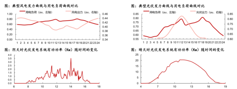 比如大的周期方面風(fēng)電受到季節(jié)性風(fēng)力波動影響,短的周期如每日不同時間段風(fēng)力差異也很大,通常出力高峰在凌晨左右,而正午則為低谷,因此波動幅度最高可達(dá)80%。光伏發(fā)電日內(nèi)波動100%,很明顯夜間光伏發(fā)電完全不出力,而白天的陰晴變化也大幅影響光伏發(fā)電的功率。