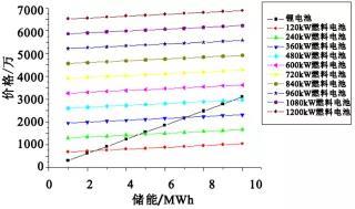 鋰電池作為儲能裝置,單位儲能價格比較穩(wěn)定,故而總儲能花費價格與儲能量成正比關(guān)系。燃料電池的儲能量也與儲存燃料成正相關(guān),不過相比于鋰電池,燃料電池的成本主要消耗在電堆系統(tǒng)制造上,燃料及其燃料儲存花費占比不大,從圖5中可以看到,其總花費不會隨著儲能量的增加而顯著增加。另外,當(dāng)總儲能一定的條件下,增加功率基本不會影響鋰電池的總成本,但會顯著增加燃料電池的成本,這是因為燃料電池的輸出功率與電堆系統(tǒng)大小有關(guān),而電堆制造占燃料電池總成本的70%以上。
