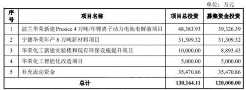 公司擬募資12億元投入波蘭華榮新建Prusice 4萬噸/年鋰離子動力電池電解液項目、寧德華榮年產(chǎn)8萬噸新材料項目、華榮化工新建實驗樓和現(xiàn)有環(huán)保設(shè)施提升項目、華榮化工智能化改造項目及補(bǔ)充流動資金。