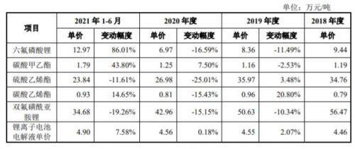 招股書顯示,今年上半年,公司六氟磷酸鋰的采購單價為12.97萬元/噸,漲幅為86.01%;碳酸甲乙酯的采購單價為1.79元/噸,漲幅為43.8%。同期電解液的單價為4.9萬元/噸,漲幅僅7.58%。