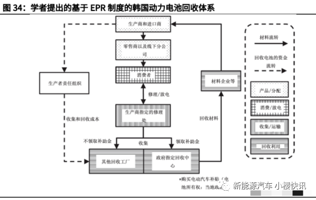 有鑒于此,有韓國學(xué)者也提出基于 EPR 制度的適用于韓國可行的動力電池回收 體系,在該回收體系中,電池生產(chǎn)者成立生產(chǎn)者責(zé)任組織以統(tǒng)籌安排回收動力電 池的相關(guān)費用,并且政府通過補助金形式促進消費者將電池轉(zhuǎn)交給政府指定回收中心,材料企業(yè)通過拆解回收獲得金屬并流轉(zhuǎn)回生產(chǎn)商或進口商,從而形成電池回收的良好循環(huán)。值得注意的是,在韓國的動力電池回收體系建立中,也有中國公司的身影,例如,格林美在 2019 年 10 月與韓國浦項市政府、ECOPRO,就 新能源汽車電池梯次利用及循環(huán)再生項目推進,簽署諒解備忘錄。