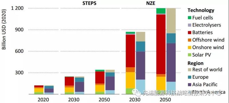 圖1 2020-2050年按技術(shù)類(lèi)別和地區(qū)劃分的清潔能源技術(shù)市場(chǎng)規(guī)模(單位:十億美元)