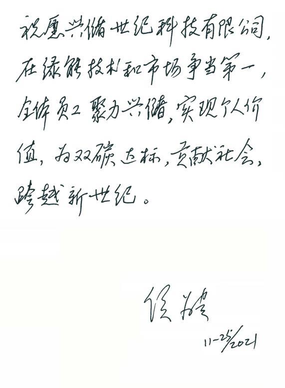 “祝愿興儲世紀科技有限公司,在綠能技術(shù)和市場爭當?shù)谝?,全體員工聚力興儲,實現(xiàn)個人價值,為雙碳達標,貢獻社會,跨越新世紀。”
