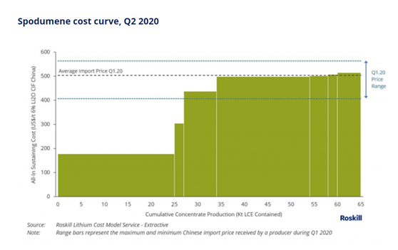 據(jù)鋰資源研究機(jī)構(gòu)Roskill官網(wǎng),2020年二季度全球鋰輝石(6%鋰精礦)成本曲線在200美元/噸至500美元/噸左右的區(qū)間。