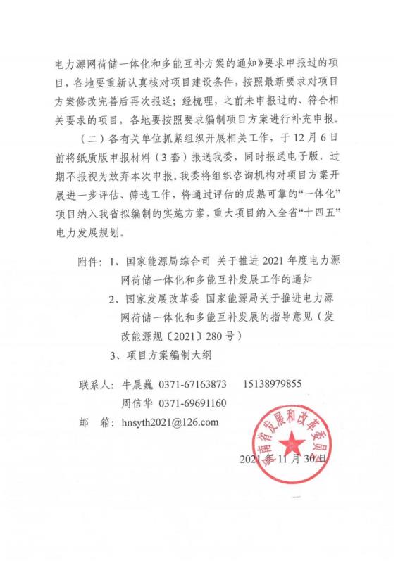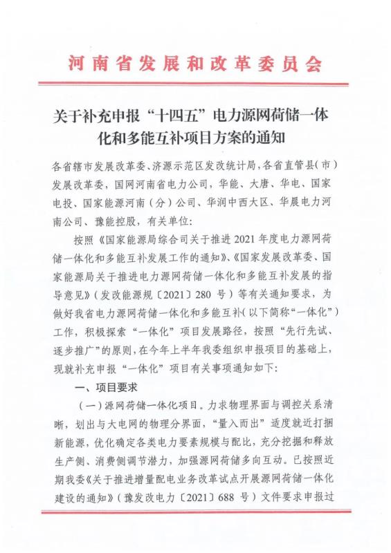 中國儲能網(wǎng)訊:11月30日,河南省發(fā)改委發(fā)布了《關(guān)于補(bǔ)充申報“十四五”電力源網(wǎng)荷儲一體化和多能互補(bǔ)項目方案》的通知。按照“先行先試、逐步推廣”的原則,在今年上半年河南發(fā)改委組織申報項目的基礎(chǔ)上,再次補(bǔ)充申報“一體化”項目。