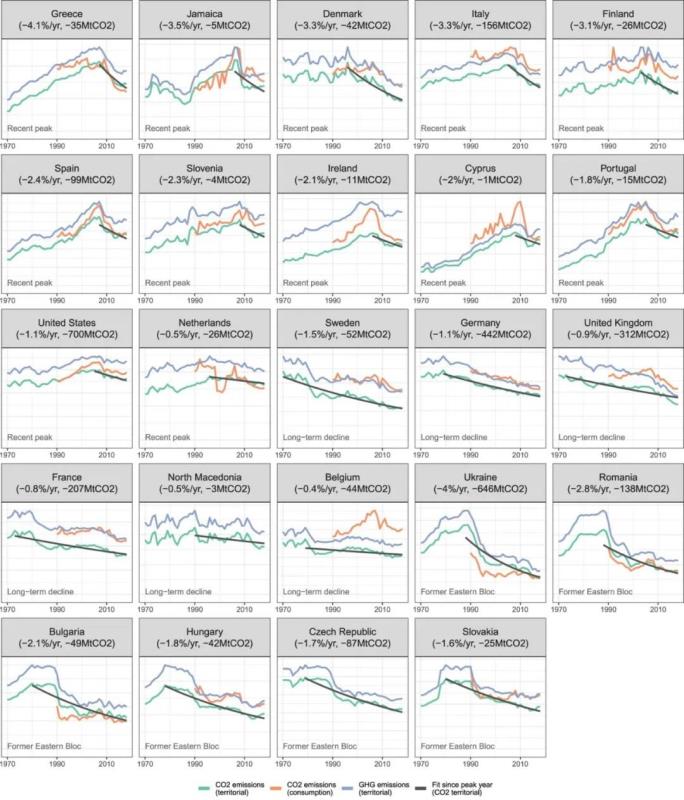 研究表明,24個(gè)領(lǐng)先者分為三組:6個(gè)早在20世紀(jì)70年代就達(dá)到峰值的早期起步者,6個(gè)在20世紀(jì)90年代迅速減少排放量并從那時(shí)起一直在下降的前東方集團(tuán)國家,12個(gè)晚起步者僅在21世紀(jì)初達(dá)到峰值。烏克蘭(自1988年以來下降了77%)、丹麥(自1996年以來下降56%)、英國(自1973年以來下降了46%)、德國(自1979年以來下降了37%)和美國(自2005年以來下降了12%)是自達(dá)峰以來減排幅度較大的國家。在發(fā)展中國家中只有牙買加,這主要是由于其全球重要的鋁土礦采礦部門的燃料節(jié)約。