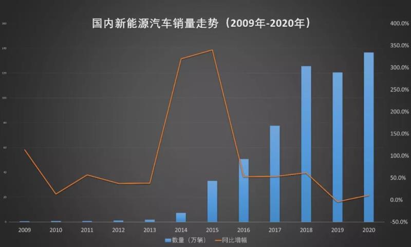 國內(nèi)新能源汽車銷量趨勢(2009年-2020年)