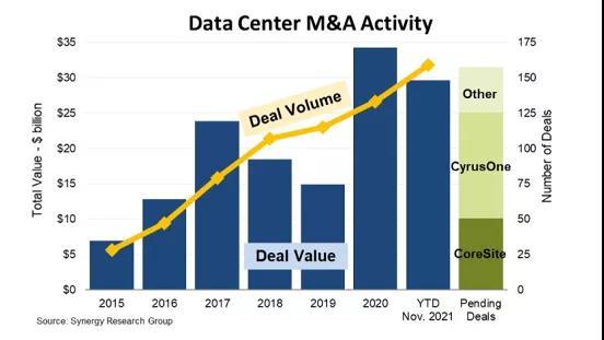 據(jù)Synergy研究統(tǒng)計,截至2021年11月中旬,今年已完成的數(shù)據(jù)中心并購交易總數(shù)已遠(yuǎn)遠(yuǎn)超過去年的創(chuàng)紀(jì)錄數(shù)量。雖然今年迄今為止完成的交易總價值尚未達(dá)到2020年的水平,但如果CoreSite的收購在年底前正式完成,2021年的交易價值至少比去年高出16%。而且由于還有幾項交易已達(dá)成一致但正在等待正式結(jié)束,因此2021年的最終數(shù)字可能會更高。