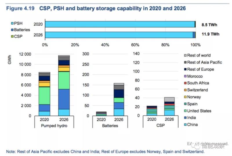安裝量的增長并不能完全展示每種儲能技術的全貌,目前來看,抽水蓄能和CSP儲能可以有效地提供中期存儲能力。通常情況下,CSP儲能時間在5-15小時。相比之下,最廣泛使用的鋰離子電池技術通常可以存儲不到4小時的電力。