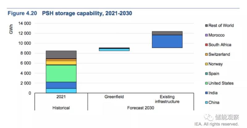 而對于PSH來說,現(xiàn)有的水庫電站和大壩可以提供機會,以有效的成本實現(xiàn)長期電力儲存。展望2030年,IEA預測在現(xiàn)有水庫上增加抽水蓄能將比新項目增加更多的儲存能力。