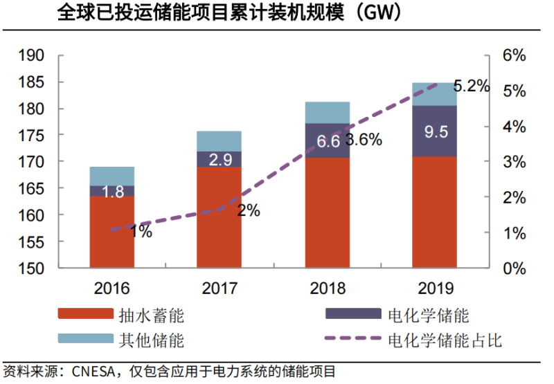根據(jù)中關(guān)村儲(chǔ)能產(chǎn)業(yè)技術(shù)聯(lián)盟統(tǒng)計(jì),截至2020年上半年,全球已投運(yùn)儲(chǔ)能項(xiàng)目累計(jì)裝機(jī)規(guī)模185.3GW,同比增長(zhǎng)1.9%;其中抽水蓄能累計(jì)裝機(jī)占比最大,占92.3%;其次為電化學(xué)儲(chǔ)能,占比5.5%。
