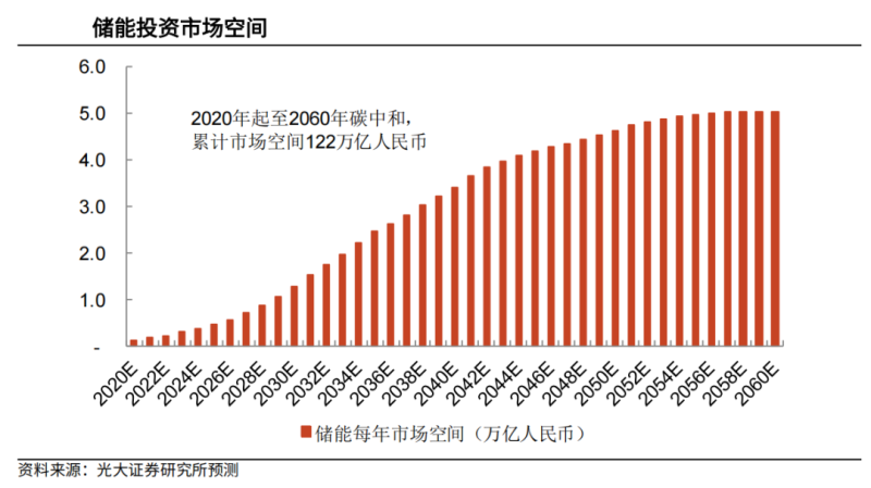 《每日經(jīng)濟(jì)新聞》記者注意到,目前市場(chǎng)普遍對(duì)儲(chǔ)能發(fā)展的前景相當(dāng)看好。光大證券測(cè)算稱(chēng),2030年儲(chǔ)能需求空間可達(dá)到1.25Twh(億千瓦時(shí)),2020年-2030年累計(jì)3.9TWh.2030年儲(chǔ)能市場(chǎng)空間有望達(dá)到1.3萬(wàn)億元,到2060年有望達(dá)到5萬(wàn)億元。