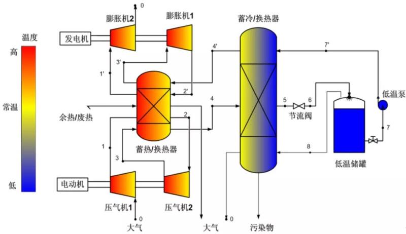 借助于空氣降溫液化技術(shù),LAES系統(tǒng)通過添加流程使空氣以液態(tài)形式儲存,如圖為一種LAES系統(tǒng)的流程圖,儲能時,經(jīng)過壓縮機的高壓空氣進入回熱器降溫和降壓設備進行液化,被液化的常壓低溫液態(tài)空氣儲存在儲液罐中;釋能時,液態(tài)空氣經(jīng)過低溫泵升壓、回熱器升溫,然后進入燃燒室,與燃料混合燃燒后進入膨脹機膨脹做功。LAES系統(tǒng)中空氣以液態(tài)形式儲存,相對于傳統(tǒng)壓縮空氣儲能,其具有不受地理環(huán)境限制、能量密度大的優(yōu)點。但是其依賴化石燃料輸入,系統(tǒng)性能受回熱器的影響較大。
