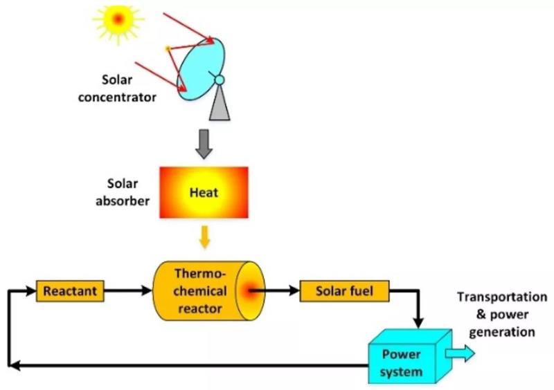 例如,太陽能熱化學儲能系統(tǒng)針對典型熱化學循環(huán)過程進行循環(huán)的切斷,實現(xiàn)了能量的時間平移,在能多時,利用熱化學原理,吸收太陽能并將其轉(zhuǎn)化為穩(wěn)定合成氣的化學能進行儲存,能少時,通過儲存合成氣的氧化/分解等反應釋放其化學能。
