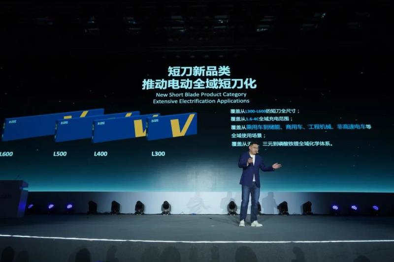 全域短刀化將涵蓋從L300-L600的全尺寸短刀電池產(chǎn)品,覆蓋從1.6-4C全域充電范圍,覆蓋從乘用車到儲能、商用車、工程機(jī)械、非高速電車等全域使用場景,覆蓋從無鈷、三元到磷酸鐵鋰全域化學(xué)體系。