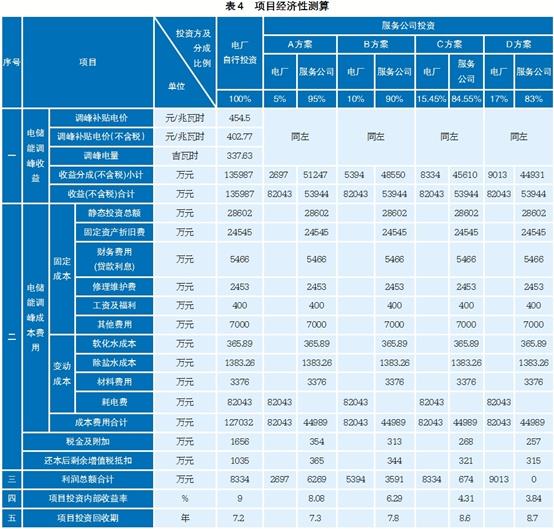 在項(xiàng)目投資內(nèi)部收益率(稅前)9%滿足調(diào)峰補(bǔ)貼電價(jià)收益的基礎(chǔ)上,比較“電廠自行投資”和采用合同能源管理經(jīng)營模式由“服務(wù)公司投資”建設(shè)運(yùn)營兩種方式,考慮A、B、C、D四個(gè)分成方案,項(xiàng)目經(jīng)濟(jì)性測算見表4。