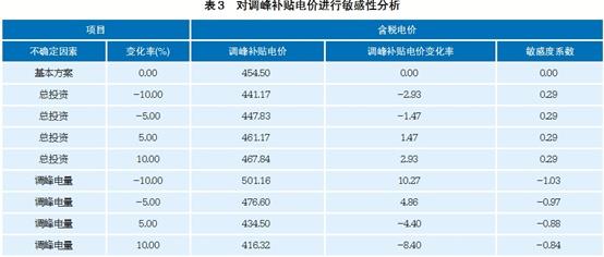 敏感性分析。當(dāng)項(xiàng)目投資內(nèi)部收益率(稅前)9%時(shí),影響項(xiàng)目經(jīng)濟(jì)性較敏感因素——總投資、調(diào)峰電量變化±5%、±10%情況下對調(diào)峰補(bǔ)貼電價(jià)進(jìn)行敏感性分析。