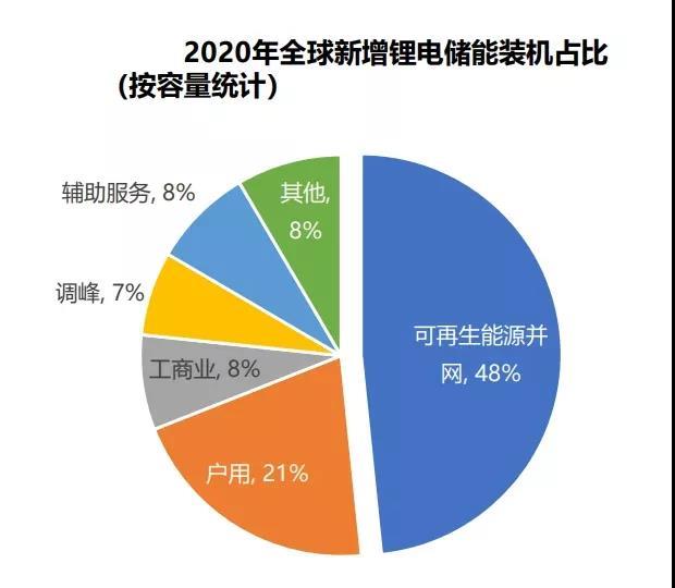 并網(wǎng)側(cè)主要是指大電站配儲,2020年全球分應(yīng)用裝機(jī)占比48%,是截至2021年最大的應(yīng)用方向。通過在風(fēng)光電站配置儲能,將可再生能源的棄風(fēng)棄光電量存儲后再移至其他時段進(jìn)行并網(wǎng),一方面,可以提高可再生能源利用率;另一方面,可以對隨機(jī)性、間歇性和波動性的可再生能源發(fā)電出力進(jìn)行平滑控制,滿足并網(wǎng)要求。2020年全球并網(wǎng)側(cè)新增儲能裝機(jī)2.6GW/5.5GWh,同比+156%,得益于儲能成本下降+配儲政策規(guī)定,大電站配儲規(guī)模提升迅速。
