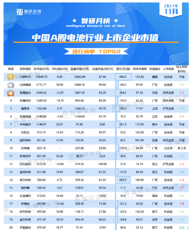 2021年11月中國(guó)A股電池行業(yè)上市企業(yè)市值排行榜(附月榜TOP60)