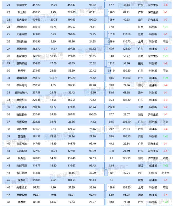 從所屬省份看,60家企業(yè)分布在17個(gè)省份,總部位于廣東的企業(yè)最多,有25家,占比高達(dá)41.67%,其中有億緯鋰能、天賜材料、欣旺達(dá)、貝特瑞4家企業(yè)總市值排名進(jìn)入前10強(qiáng),7家企業(yè)坐落于浙江,其中總市值最高的是排名第12的杉杉股份;從上市板塊來(lái)看,21家企業(yè)在滬深主板上市,20家企業(yè)在創(chuàng)業(yè)板上市,16家企業(yè)在科創(chuàng)板上市,以及上月3家企業(yè)在北交所上市。