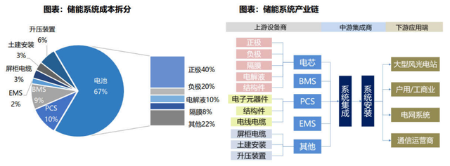 產(chǎn)業(yè)鏈比較龐大,延伸較長,包括了鋰電池(成本占比67%)、儲能變流器(簡稱PCS,成本占比10%),電池管理系統(tǒng)(簡稱BMS,成本占比10%)以及能量管理系統(tǒng)(簡稱EMS,成本占比2%)。