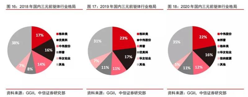 2018-2020 年國內(nèi)CR5分別為62%/69%/65%。市場格局在2020年發(fā)生了變化,受武漢疫情影響,格林美2020年全年出貨量4.15萬噸,較2019年減少約30%。中偉股份升至行業(yè)市占率第一名,格林美退居第三。