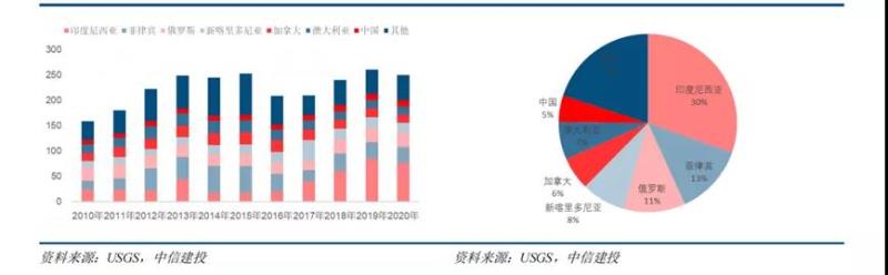 ▲左:全球鎳礦產(chǎn)量(萬噸),右:2020全球鎳礦產(chǎn)量分布(%)