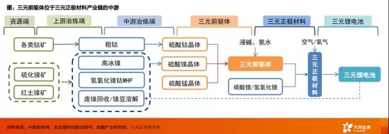 從三元鋰電池的產(chǎn)業(yè)鏈上來看,上游為鈷鎳等礦產(chǎn)資源,中游為三元前驅(qū)體和三元正極材料,下游為三元鋰電池。