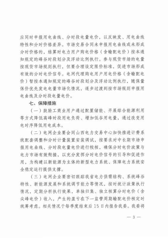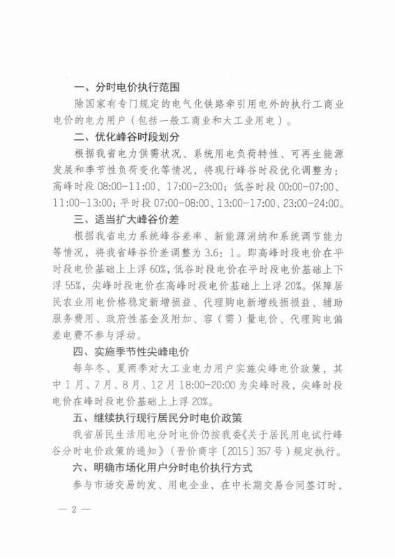 將峰谷價差調(diào)整為3.6:1。即高峰時段電價在平時段電價基礎上上浮 60%,低谷時段電價在平時段電價基礎上下浮55%,尖峰時段電價在高峰時段電價基礎上上浮 20%。保障居民農(nóng)業(yè)用電價格穩(wěn)定新增損益、代理購電新增線損損益、輔助服務費用、政府性基金及附加、容(需)量電價、代理購電偏差電費不參與浮動。