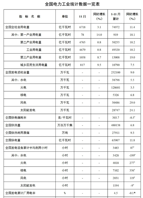 1-11月份,全國發(fā)電設(shè)備累計平均利用3483小時,比上年同期增加87小時。其中,核電7102小時,比上年同期增加356小時;風(fēng)電2031小時,比上年同期增加119小時。