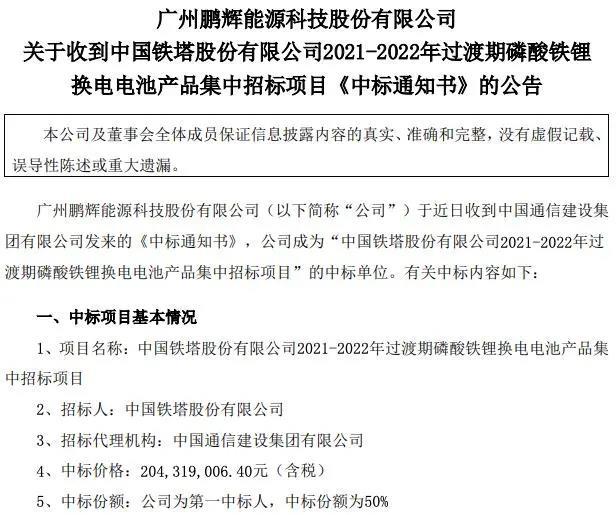 公告提到,鵬輝能源中標(biāo)中國鐵塔股份有限公司2021-2022年過渡期磷酸鐵鋰換電電池產(chǎn)品集中招標(biāo)項(xiàng)目,中標(biāo)價(jià)格2.04億元,公司為第一中標(biāo)人,中標(biāo)份額為50%。
