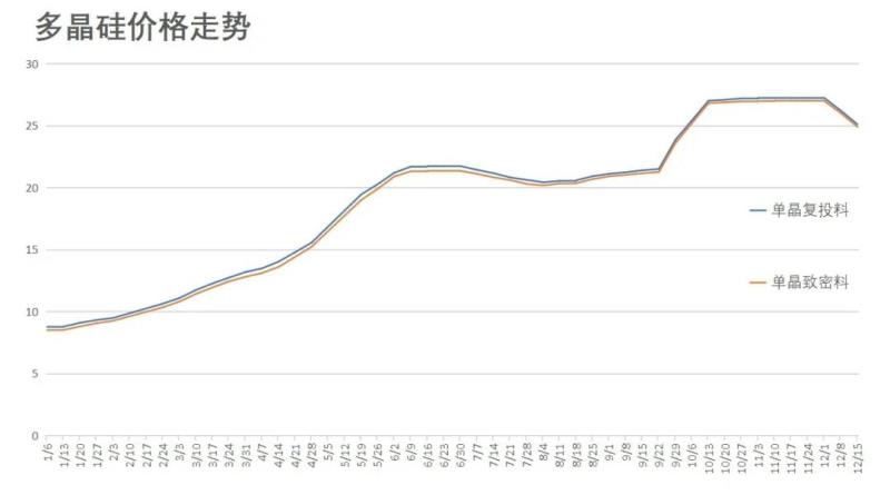 8月中旬,硅料開啟了第二階段的漲價(jià)潮。此后,經(jīng)歷了連續(xù)十二周的連漲,單晶復(fù)投料和單晶致密料分別從20.53萬(wàn)元/噸和20.32萬(wàn)元/噸升至27.22萬(wàn)元/噸26.99萬(wàn)元/噸的峰谷,且超過(guò)一個(gè)月保持在該高位不見松動(dòng)。