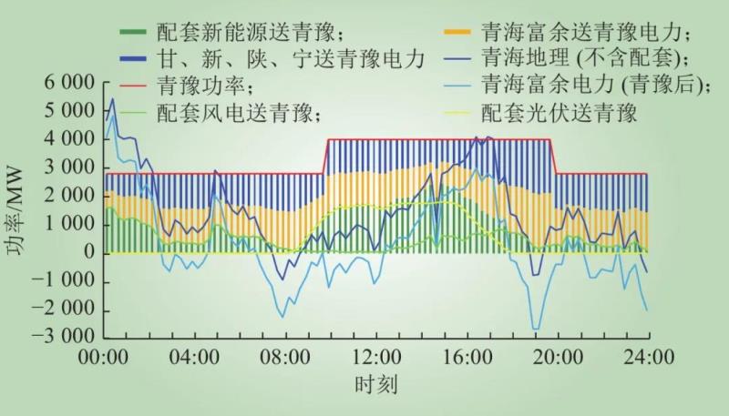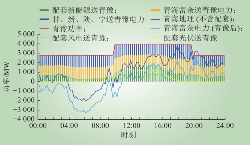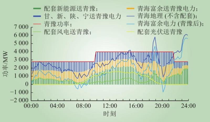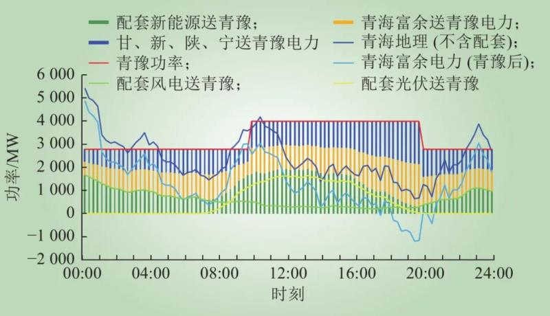 注:圖中各量均為有功電力,其中:設置新能源小發(fā)月份的配套風電、配套光伏曲線;根據(jù)青豫直流打捆方式原則,設置青海地理(不含配套)曲線=青?;痣姵隽?青海水電出力+青海風電出力+青海光伏出力?青海負荷出力?配套風電出力?配套光伏出力;設置青豫直流外送曲線=配套新能源送青豫電力+青海富余送青豫電力+甘、新、陜、寧送青豫電力;配套新能源送青豫=配套風電送青豫+配套光伏送青豫,配套新能源全部通過青豫直流外送;青海富余送青豫電力為青海電網(wǎng)內(nèi)配套風電和配套光伏之外的通過青豫直流外送的清潔能源;為了測算打捆交易靈活互濟電力,設置青海富余電力(青豫后)=青海地理(不含配套)?青海富余送青豫電力。