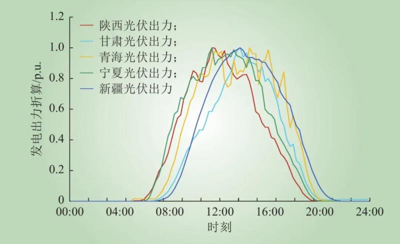 西北電網(wǎng)東西跨度3000 km,在新能源方面,分布有酒泉風電光伏基地、達坂城風電光伏基地、青海海西海南風電光伏基地;在水電方面,覆蓋黃河流域、漢江流域、白龍江流域;風電、光伏、水電在時空特性上存在一定的互補特性和接續(xù)特性。以光伏為例,西北電網(wǎng)隨著緯度從東向西變化,光伏發(fā)電呈現(xiàn)一定的接續(xù)性,如圖11典型日光伏出力曲線所示,陜西光伏出力極值時刻為11:30,寧夏光伏出力的極值時刻為12:00,甘肅光伏出力極值時刻為13:45,青海光伏出力極值時刻為14:00,新疆光伏出力的極值時刻為14:30,西北光伏出力呈現(xiàn)明顯的接續(xù)特性。運用這一特性,可以靈活開展互濟交易,實現(xiàn)電能互補,保證光伏整體外送的連續(xù)穩(wěn)定性。