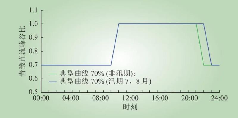 由圖5可知,青海電網(wǎng)光伏出力主要分布在10:00—16:00,河南電網(wǎng)用電高峰期(晚高峰)主要集中在17:30—21:30。根據(jù)青海電網(wǎng)以及西北其他省區(qū)發(fā)電特性和發(fā)電能力,結合河南電網(wǎng)(華中電網(wǎng))負荷特性,測定特高壓青豫直流典型運行曲線,如圖6所示,高峰段時間為10:00—21:00(非汛期),10:00—22:00(汛期7月、8月),其他時段為低谷時段,青豫直流峰谷比為1∶0.7。