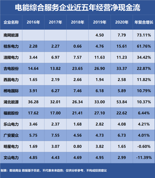 從近五年經(jīng)營凈現(xiàn)金流復合增長來看,南網(wǎng)能源、桂東電力、涪陵電力、吉電股份等4家企業(yè)增幅超過20%,其中吉電股份復合增長達22.87%。
