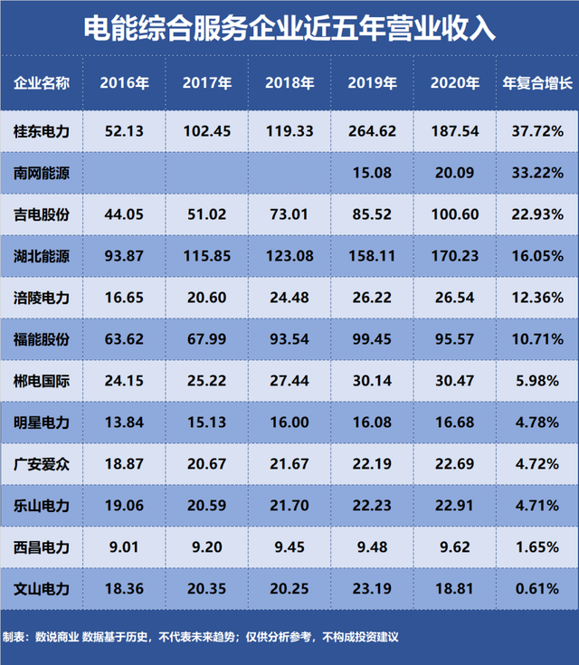 從近五年營收復合增長來看,桂東電力、南網(wǎng)能源、吉電股份等3家企業(yè)增幅超過20%,其中桂東電力復合增長達到37.72%。