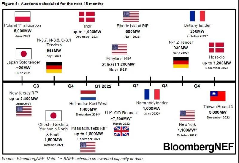 海上風電競價的公示不斷加速。德國的RWE贏得了丹麥的1GW Thor項目競價。德國則舉辦了全新中心化框架下的首次競價,項目容量為958MW。美國新澤西州在該國目前最大的一輪海上風電采購競價中批準新建近2.7GW的裝機容量,項目預計將在2025年至2030年間投產(chǎn)。