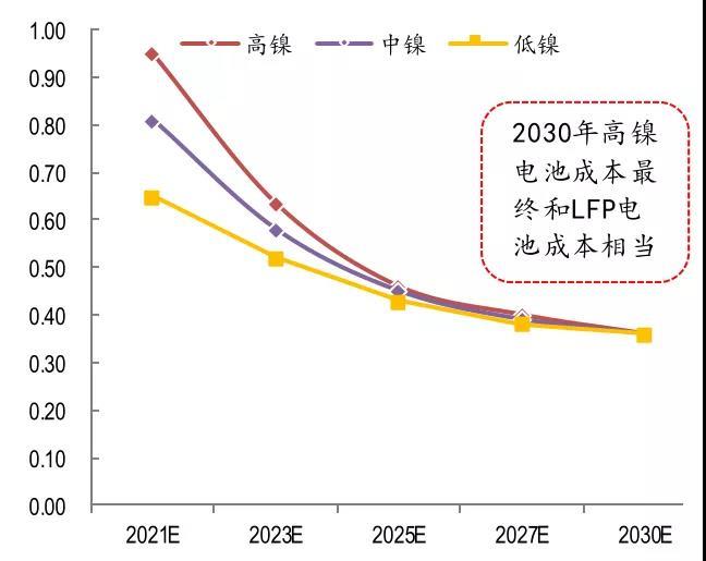 從長(zhǎng)期看,三元高鎳和磷酸鐵鋰的成本差距會(huì)越來(lái)越小。根據(jù)財(cái)通證券的測(cè)算,預(yù)計(jì)2030年高鎳電池成本最終會(huì)和磷酸鐵鋰相當(dāng)。